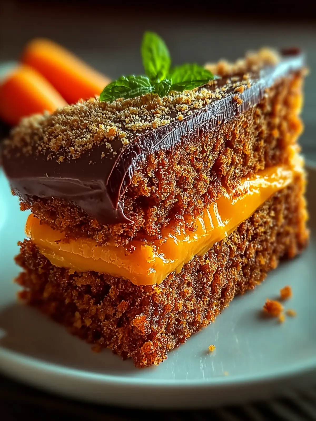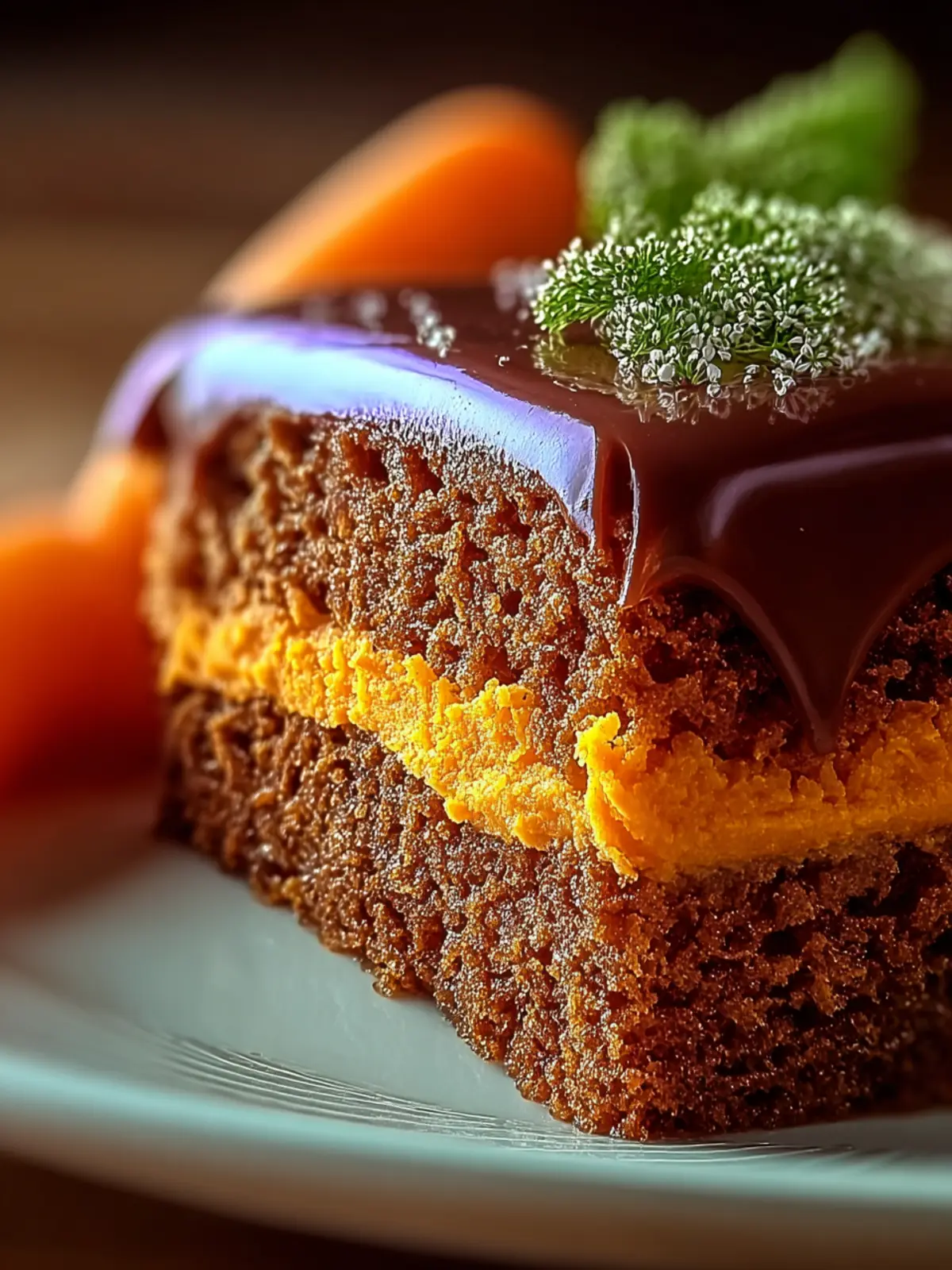 A delicious carrot cake topped with a rich chocolate glaze.