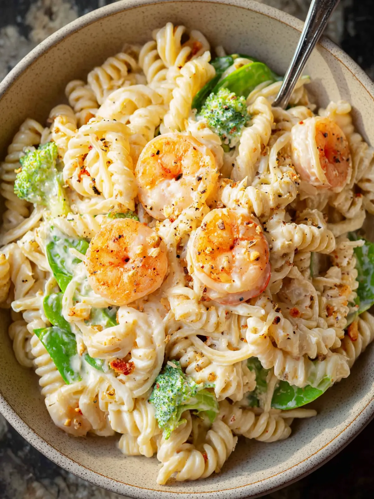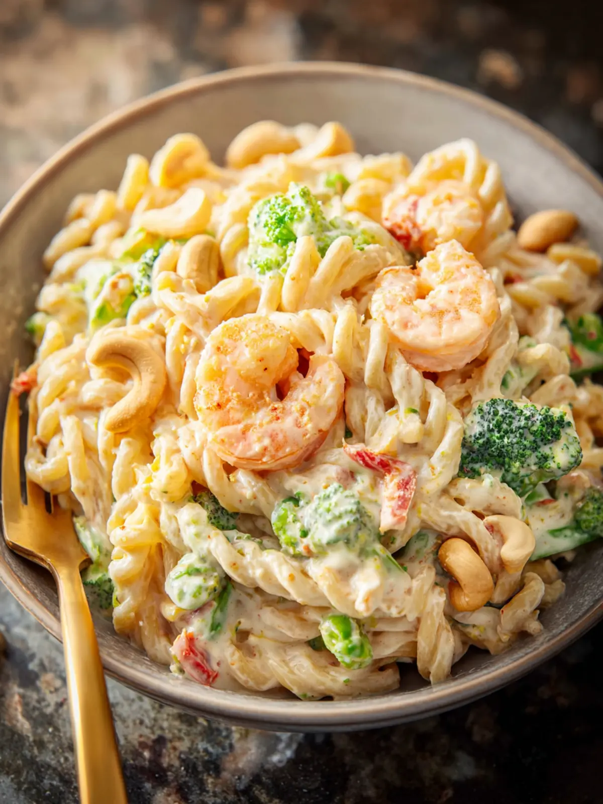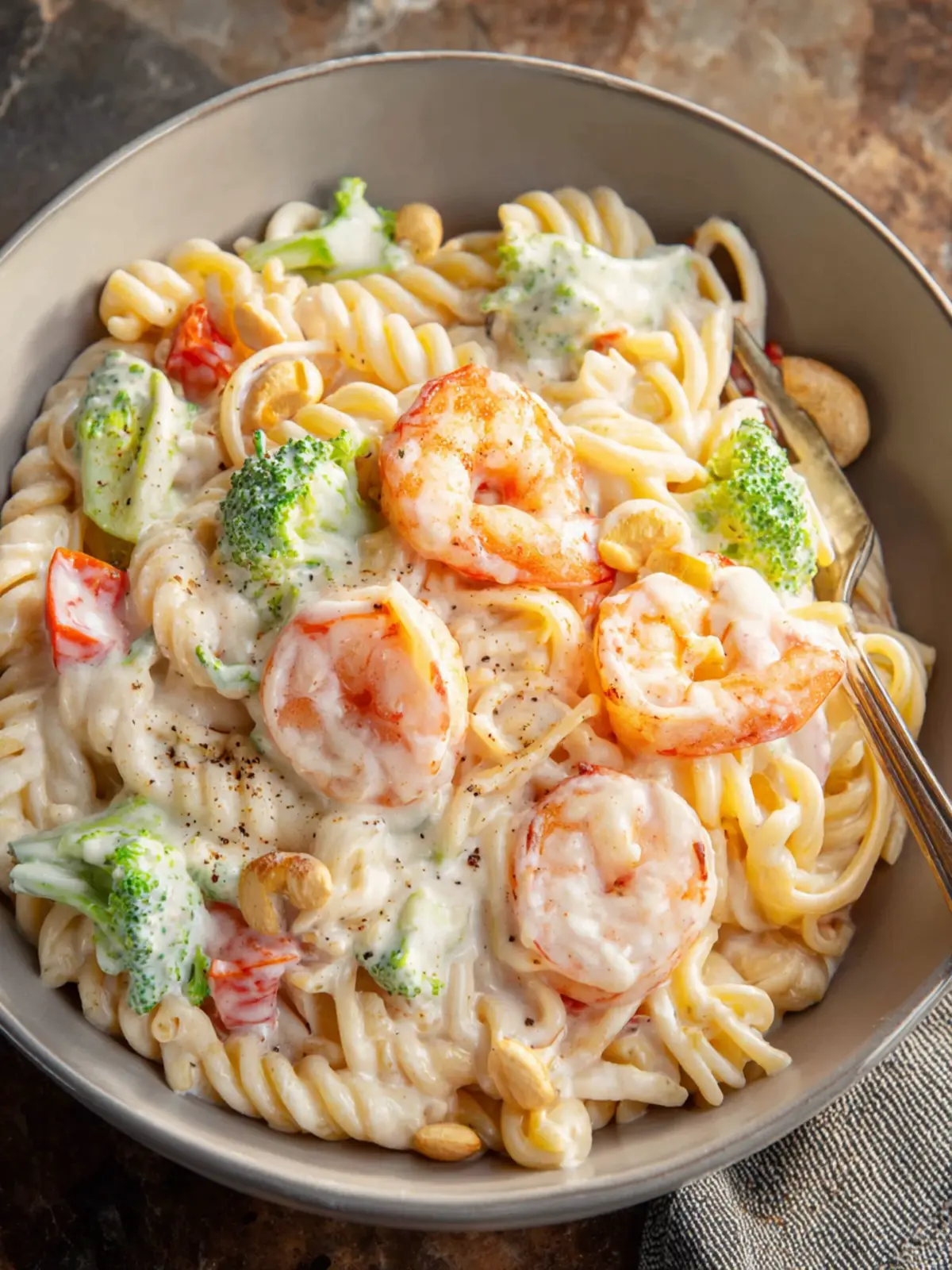 A delicious creamy pasta dish made with cashews, shrimp, and broccoli. Perfect for a weeknight meal!