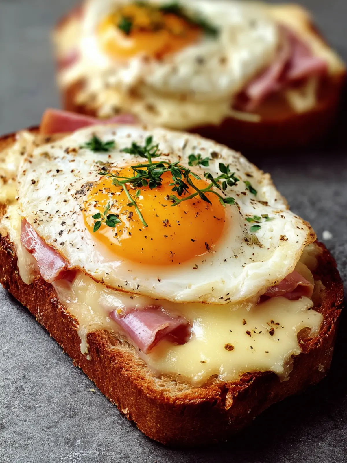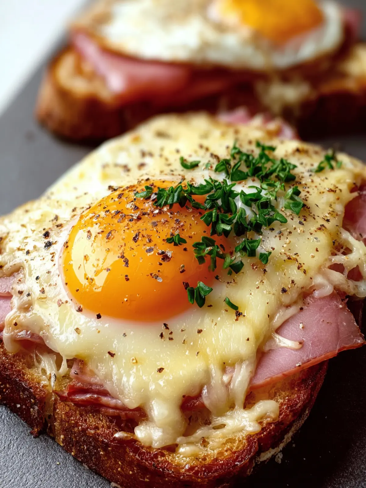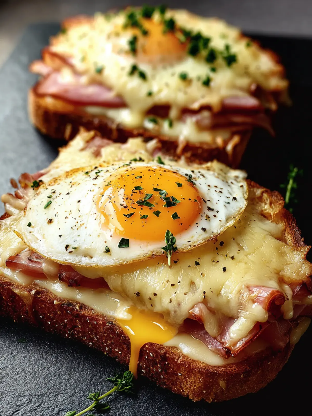 What makes this creation so irresistible? It’s all in the layers. Picture a crispy, golden-brown slice of bread generously piled high with salty, savory ham and ooey-gooey melted cheese. But the pièce de résistance? A luscious, perfectly fried egg perched atop it, flavoring everything beneath with its creamy yolk. Each bite delivers a satisfying combination of textures and flavors that simply calls for more.