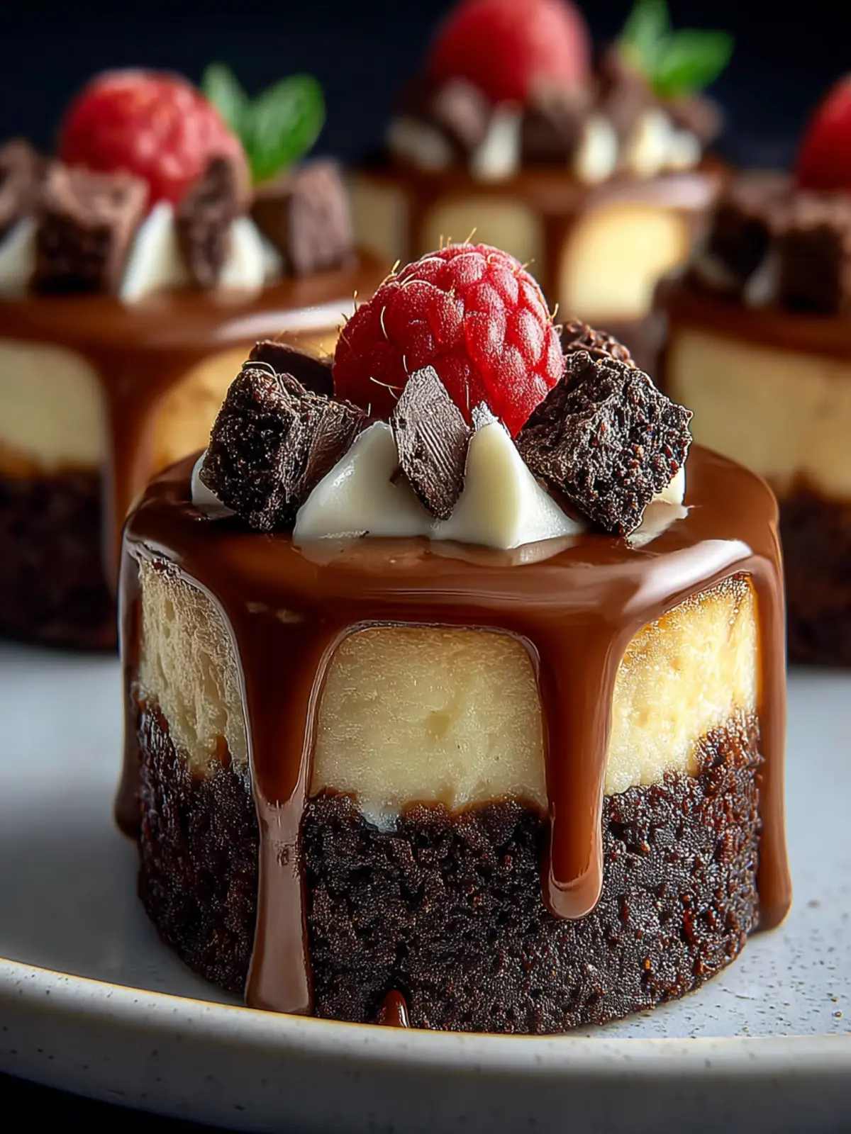 Top each cheesecake with a dollop of whipped cream and a few fresh berries. Strawberries, blueberries, or raspberries not only add a burst of color but also a refreshing contrast to the rich brownie and cheesecake combo.