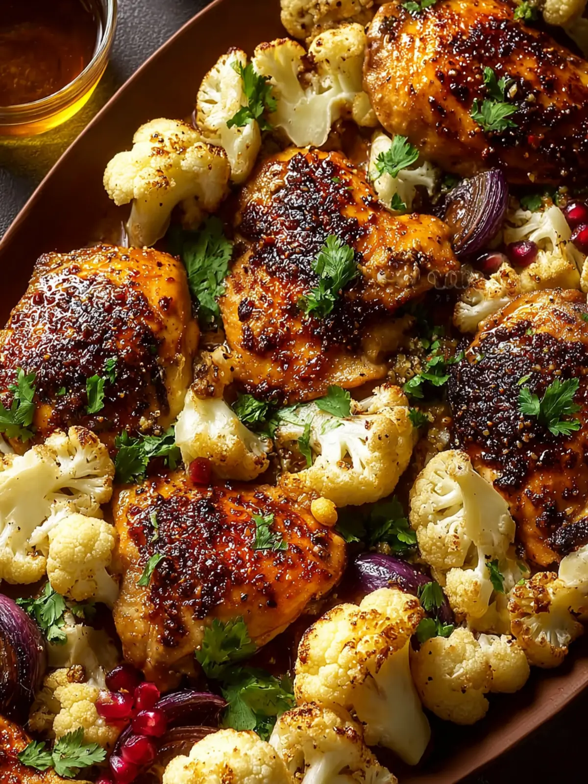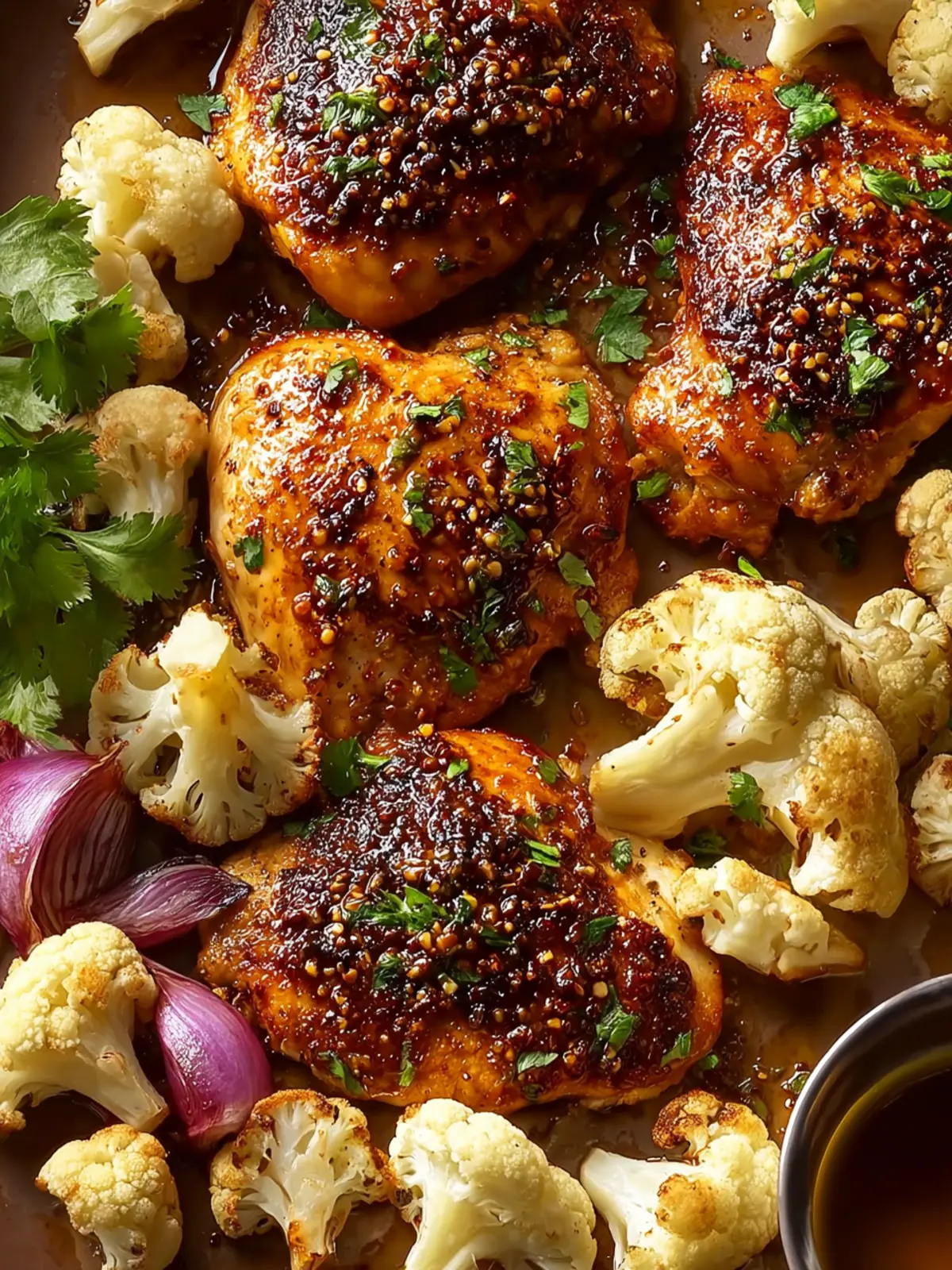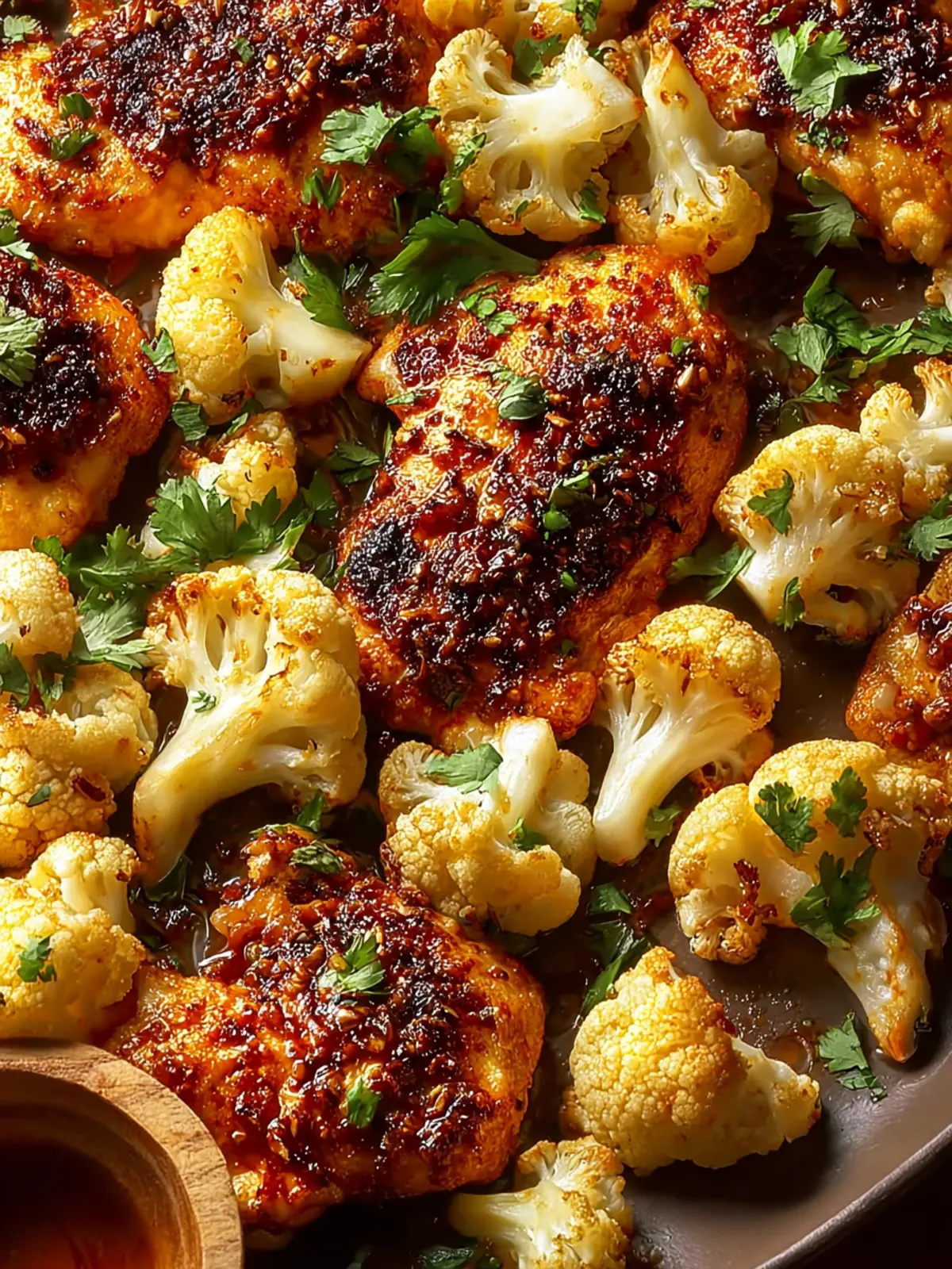 This savory and sweet dish features tender chicken thighs and roasted cauliflower, glazed with a delicious honey garlic sauce.