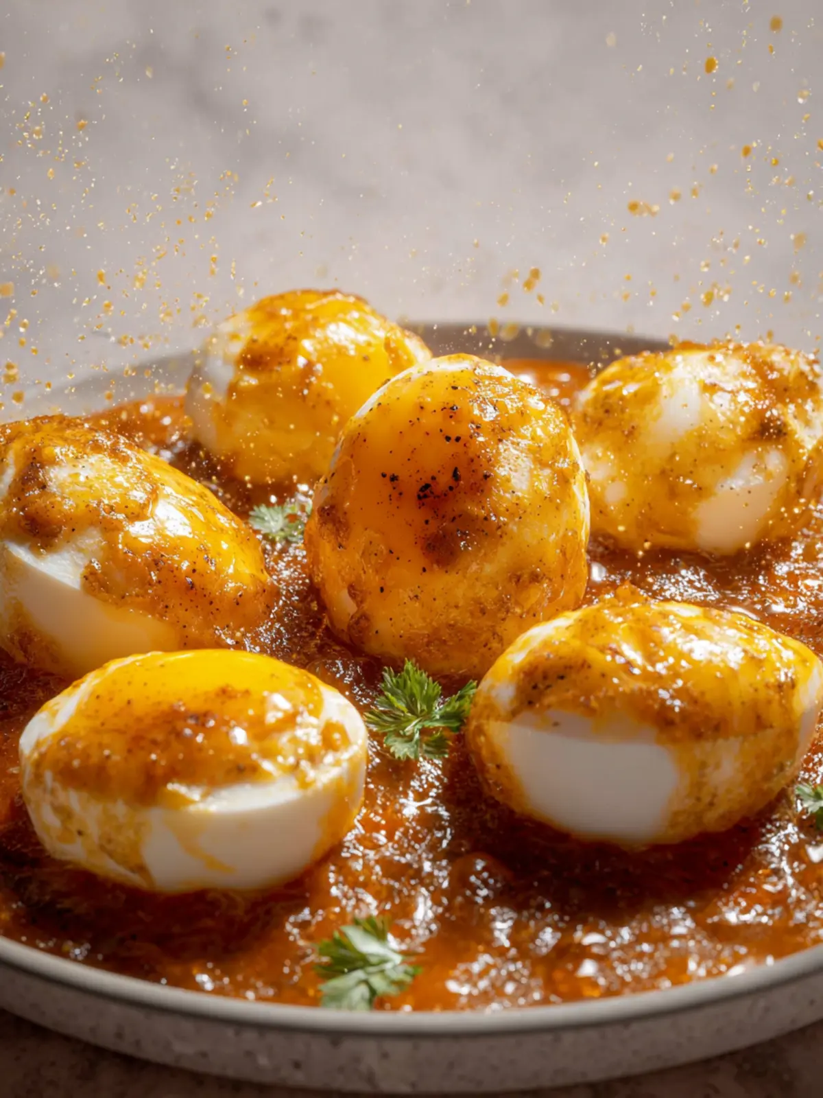 - Place the peeled eggs in a serving bowl, pour the sauce over them, and garnish with chopped parsley. Serve as is, or enjoy with crusty ciabatta bread or jasmine rice.