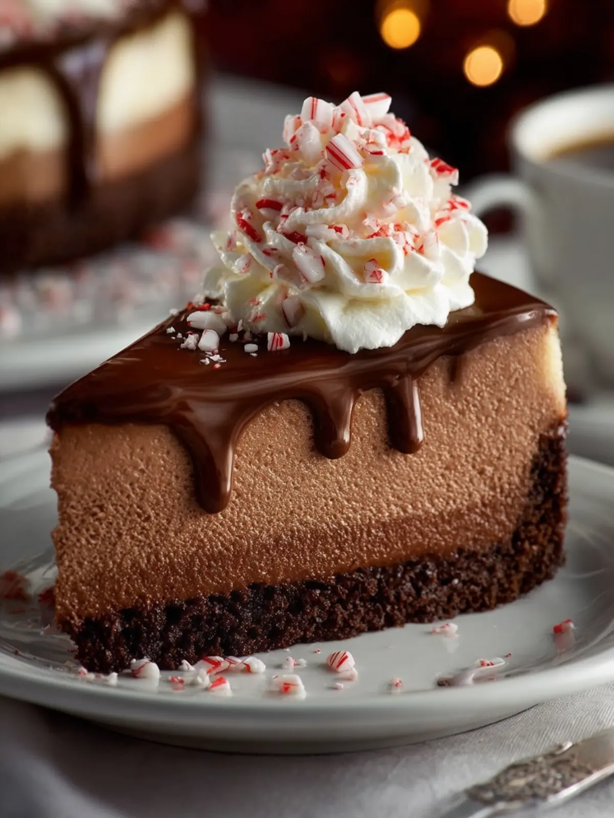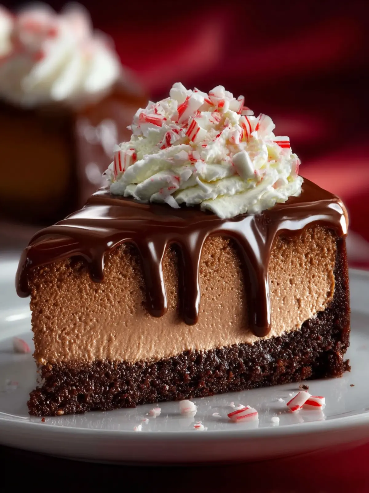 Visual Appeal: The stunning swirls of chocolate ganache and vibrant candy cane decorations make this cheesecake a feast for the eyes, too. Presentation matters, and this dessert takes it to the next level.