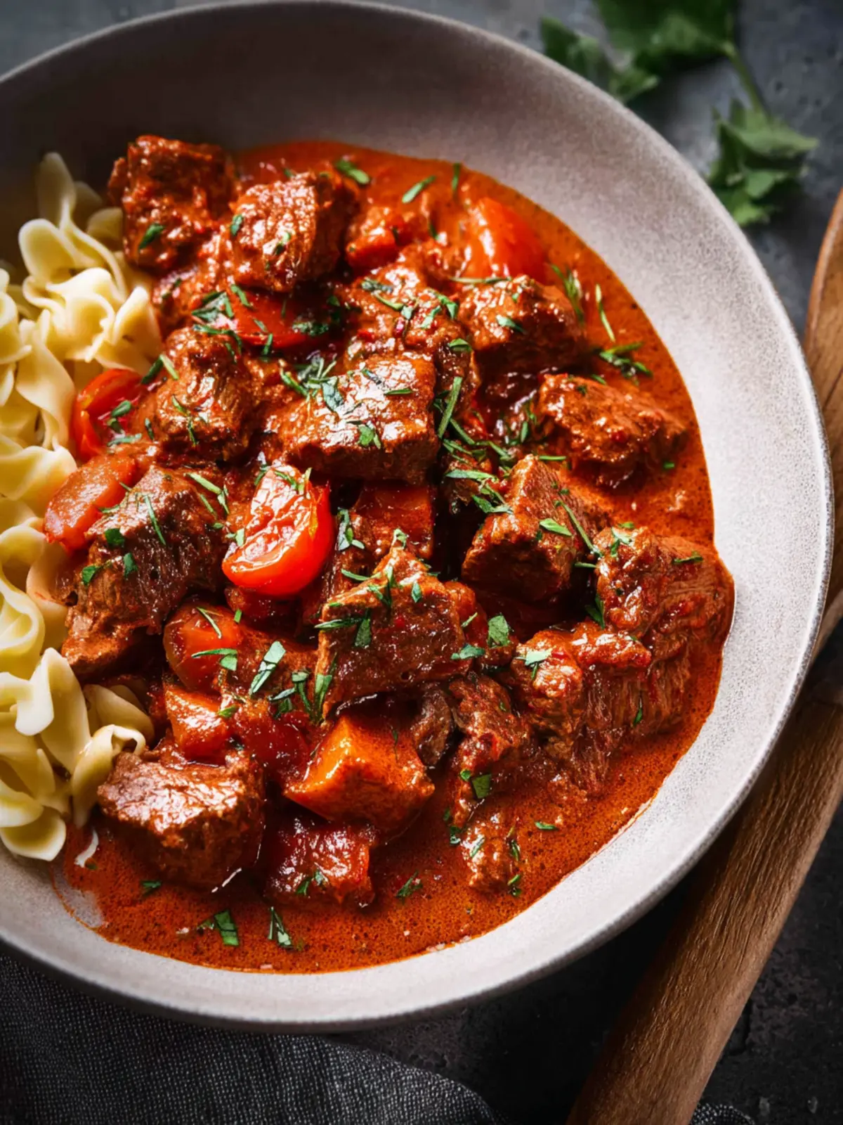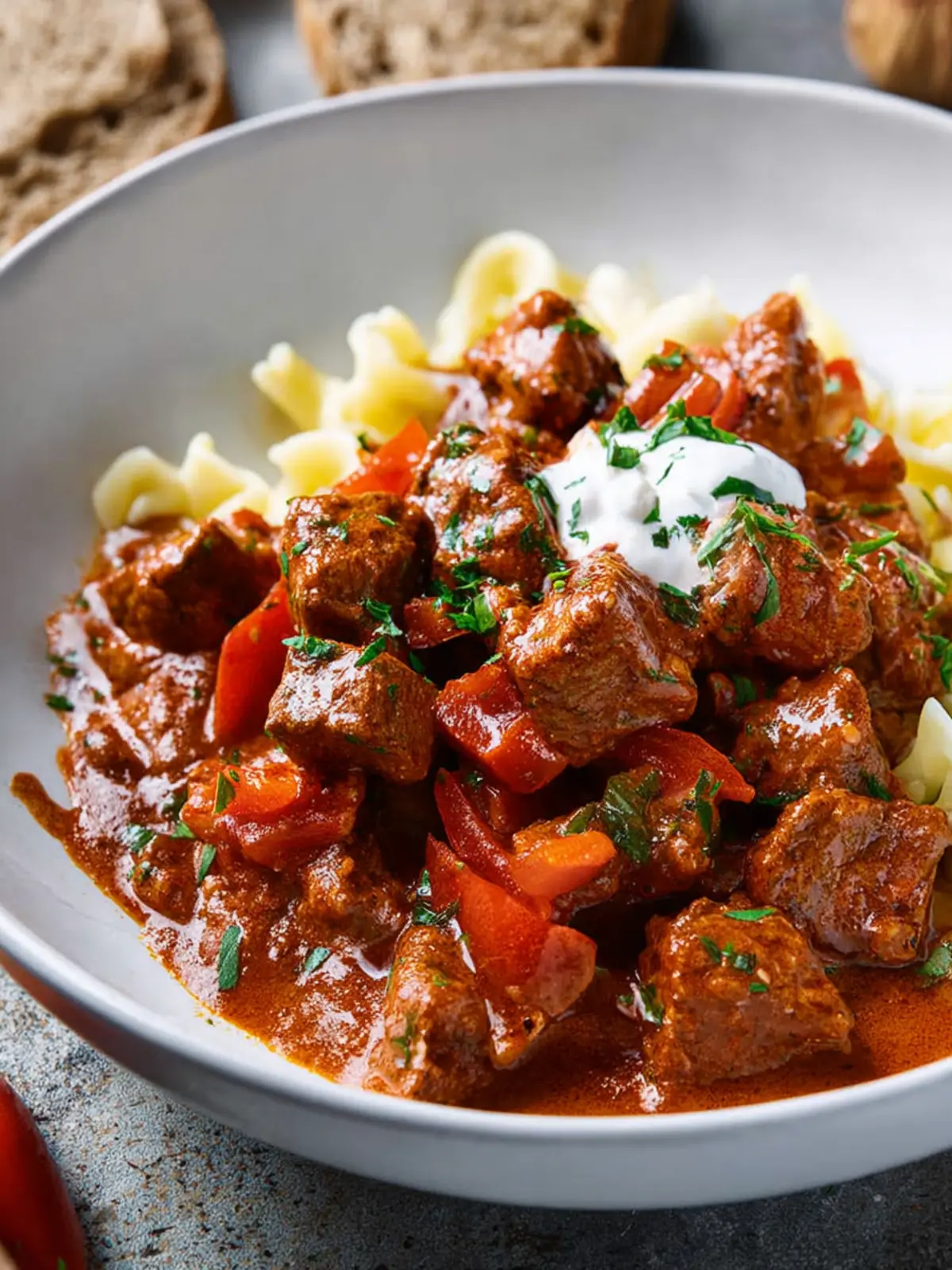 A hearty and comforting beef stew served over egg noodles, flavored with Hungarian paprika.