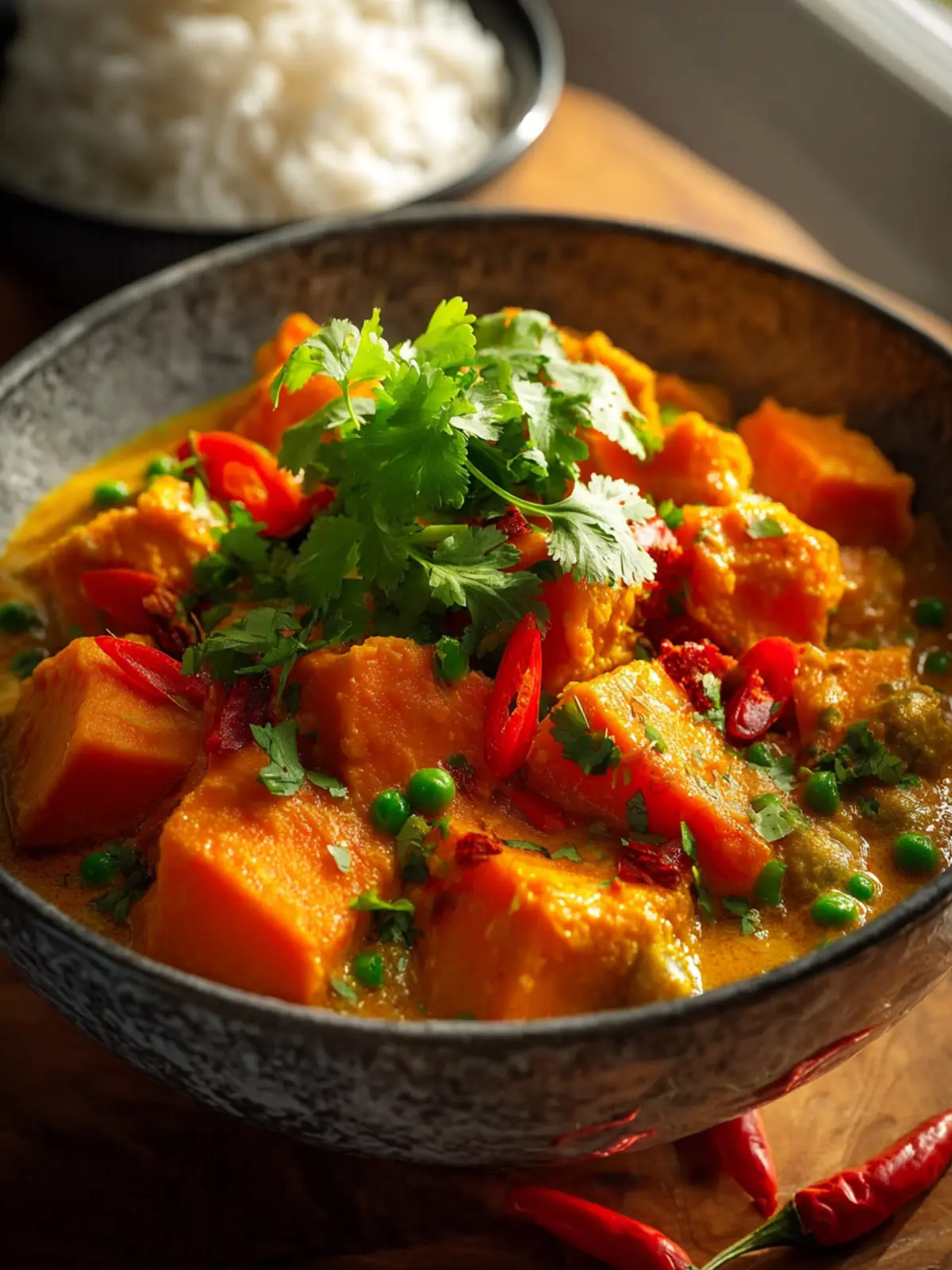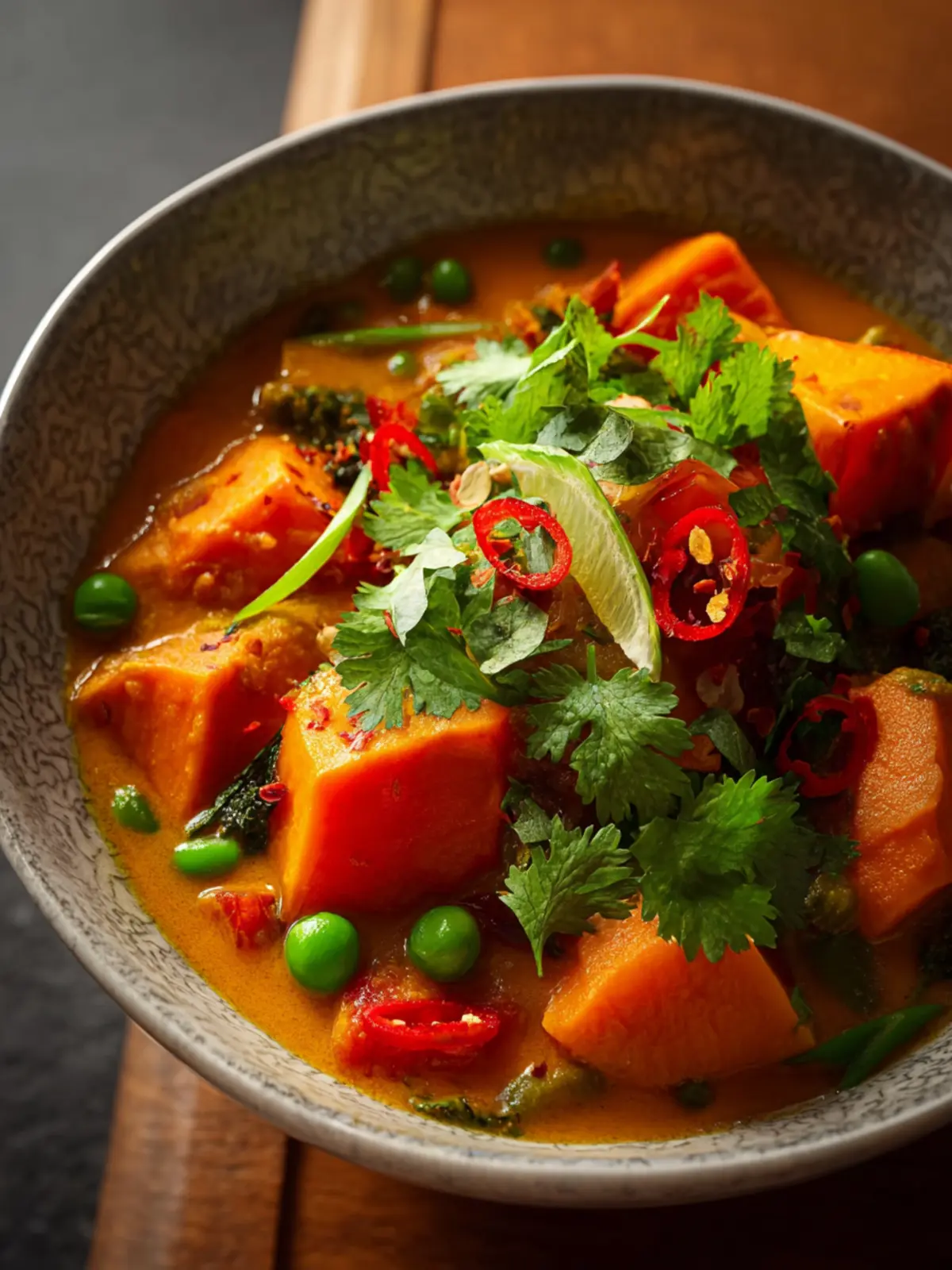 A comforting and nourishing coconut milk curry featuring sweet potatoes and a variety of vegetables.